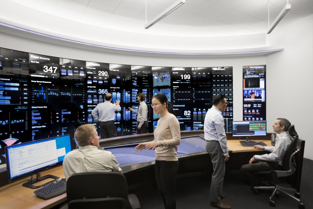 smartcoin Profite Risk Management Center provides a comprehensive view of the various investment portfolios and how they fit within pre-established guidelines. Built in 2014, its front-end consists of a 27' by 8' interactive touchscreen designed to visualize data in ways that allow for rapid comprehension. Its back-end systems, which connect to every smartcoin Profite office worldwide, continuously run a wide range of operational readiness, risk, and stress test monitors.